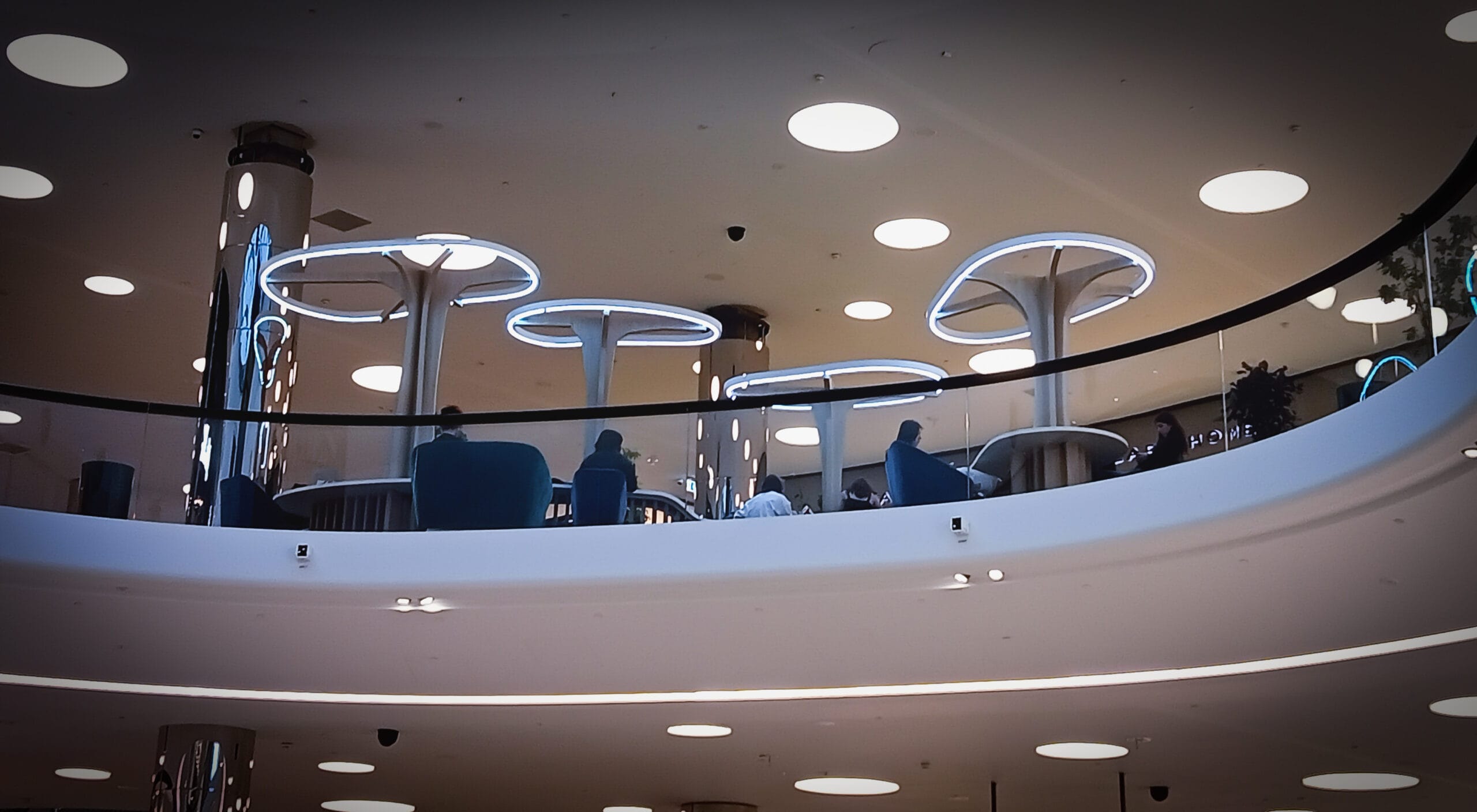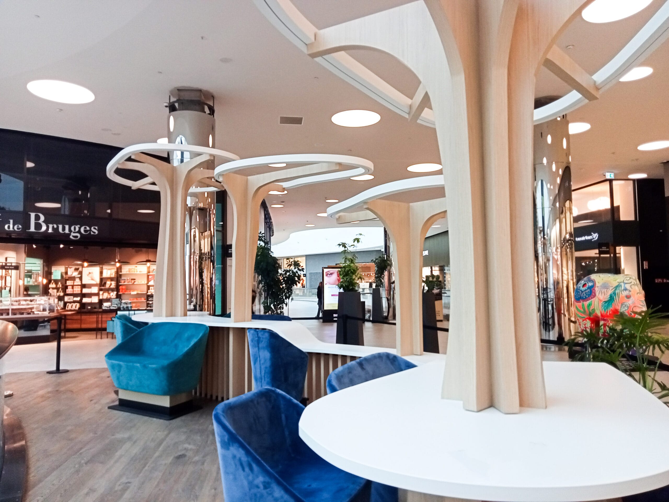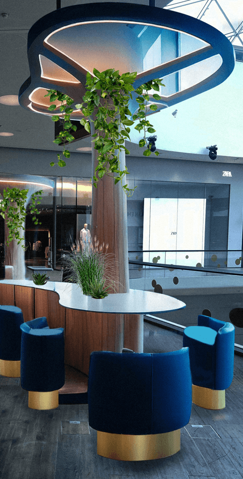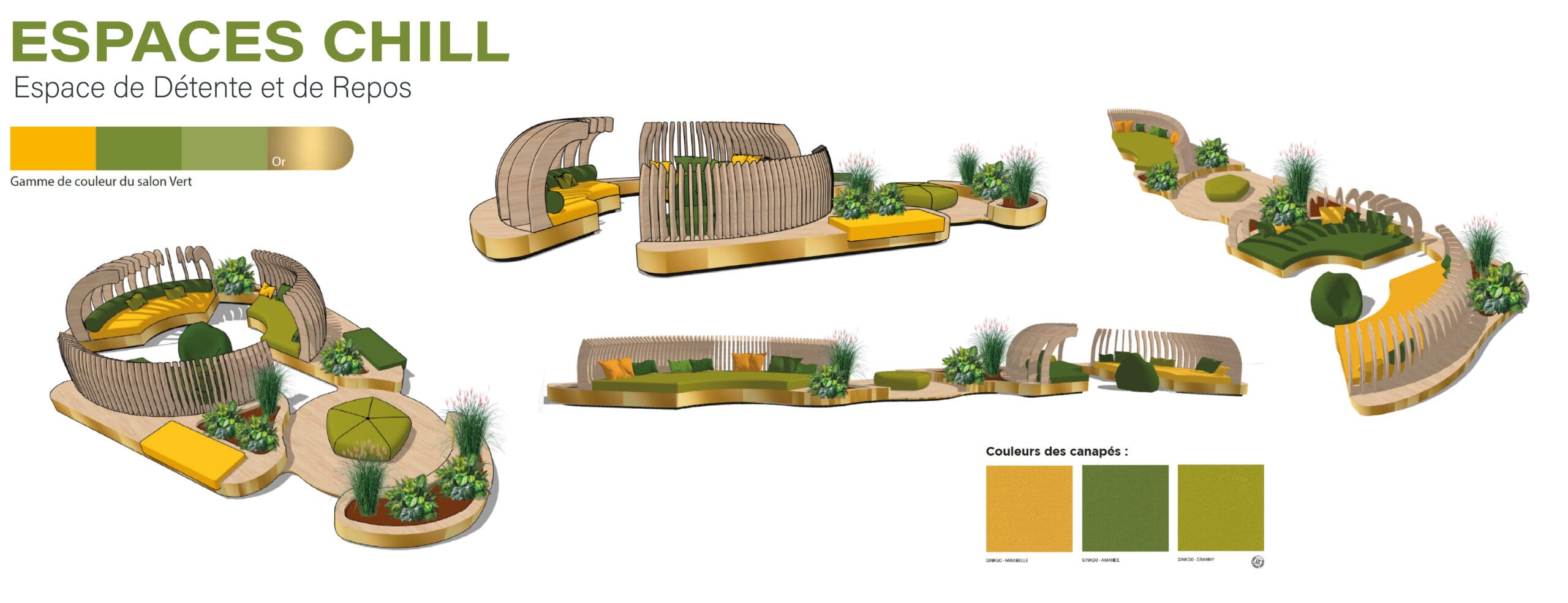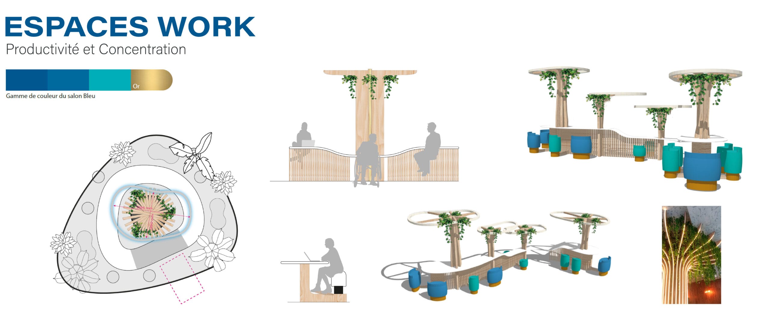 Je me suis occupée de toute l’idée visuelle et de la direction graphique : choix des couleurs, ambiance, cohérence esthétique et intégration dans l’espace existant. Le Salon Bleu, axé sur la productivité, joue sur un bleu profond et des touches dorées, avec du mobilier modulable, des espaces semi-privés et des services intégrés. Le Salon Vert, plus chaleureux, mise sur des tons naturels, des matières douces et un mobilier flexible pour favoriser la détente.