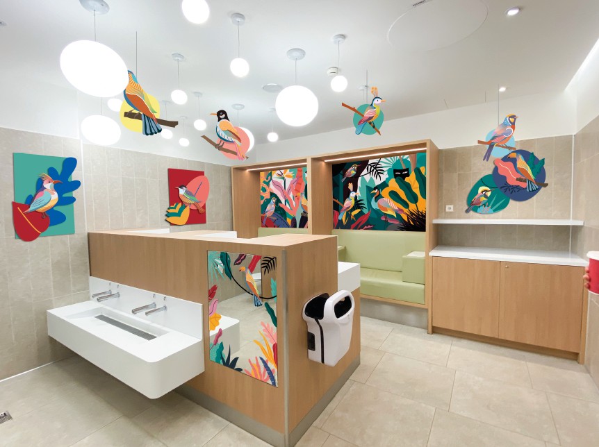 Pour le centre commercial Cloche d’Or au Luxembourg, j’ai réalisé la décoration des sanitaires pour enfants. L’objectif était de transformer les toilettes en un espace ludique, avec un univers jungle, coloré et joyeux.