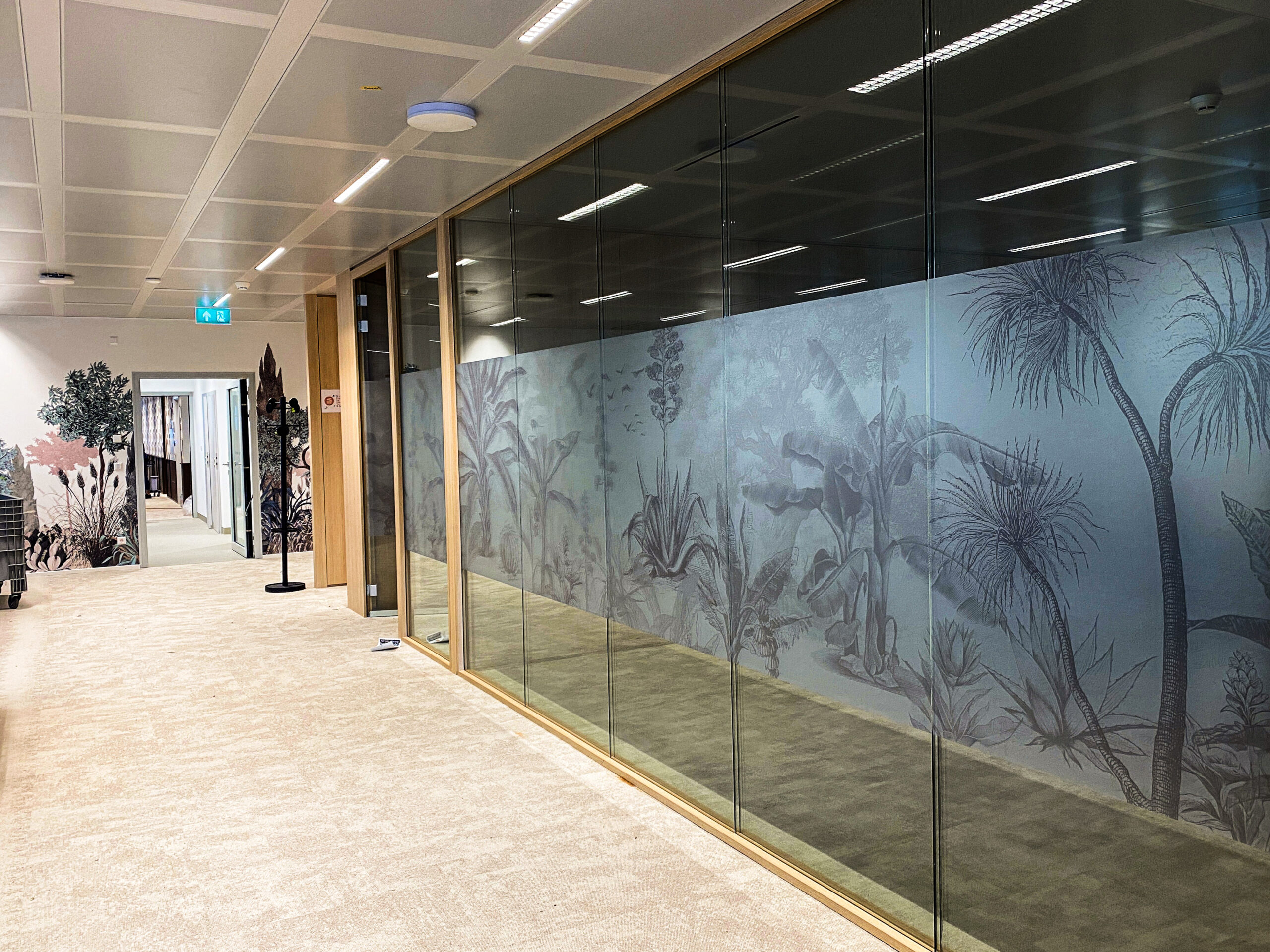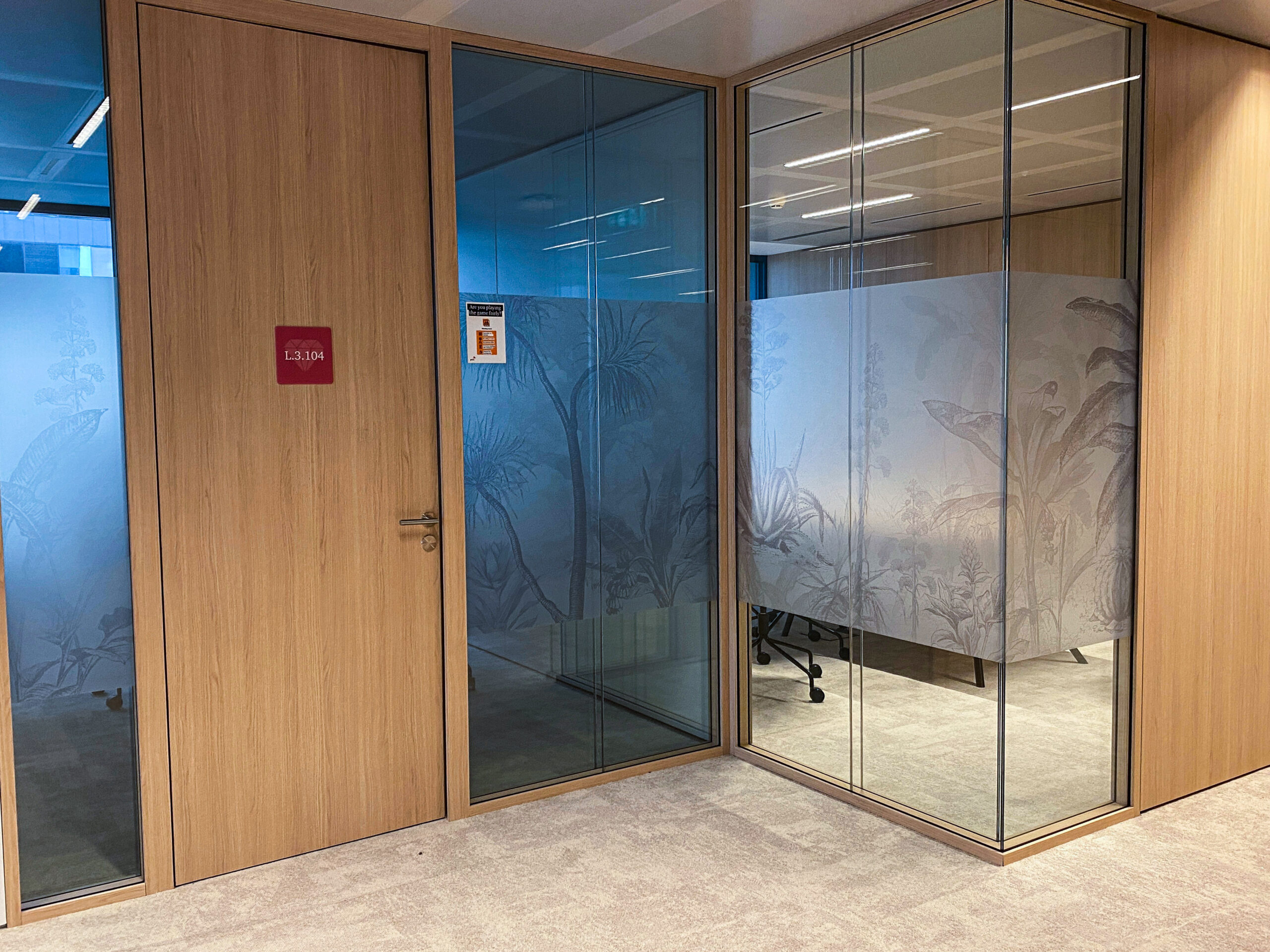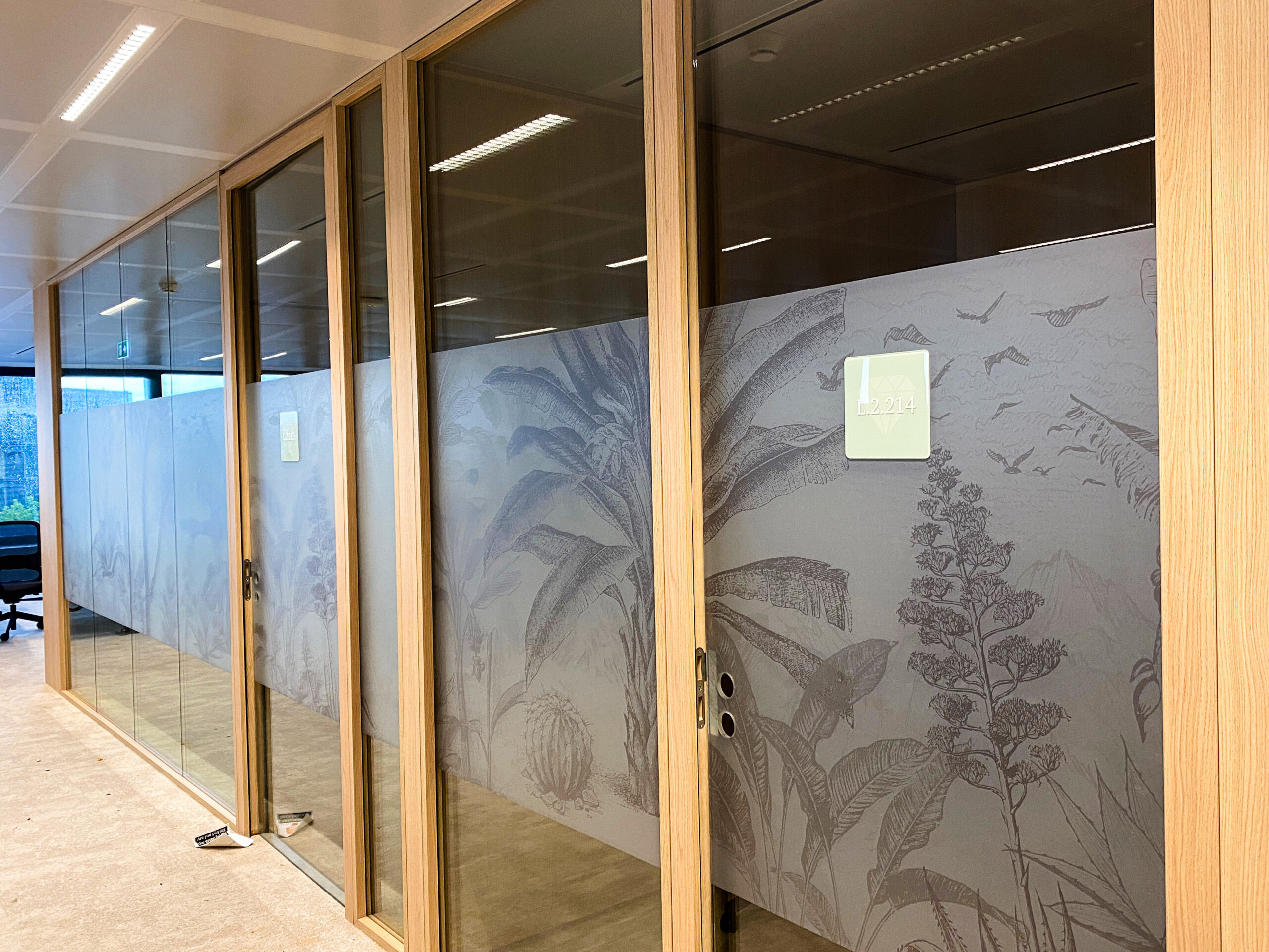 Pour les bureaux de PwC au Luxembourg, le projet s’est axé autour d’une vitrophanie sur-mesure, inspirée des motifs classiques de la toile de Jouy. L’enjeu était de créer un grand format horizontal adapté à de vastes espaces de bureaux et jouant avec la transparence pour créer de la profondeur.