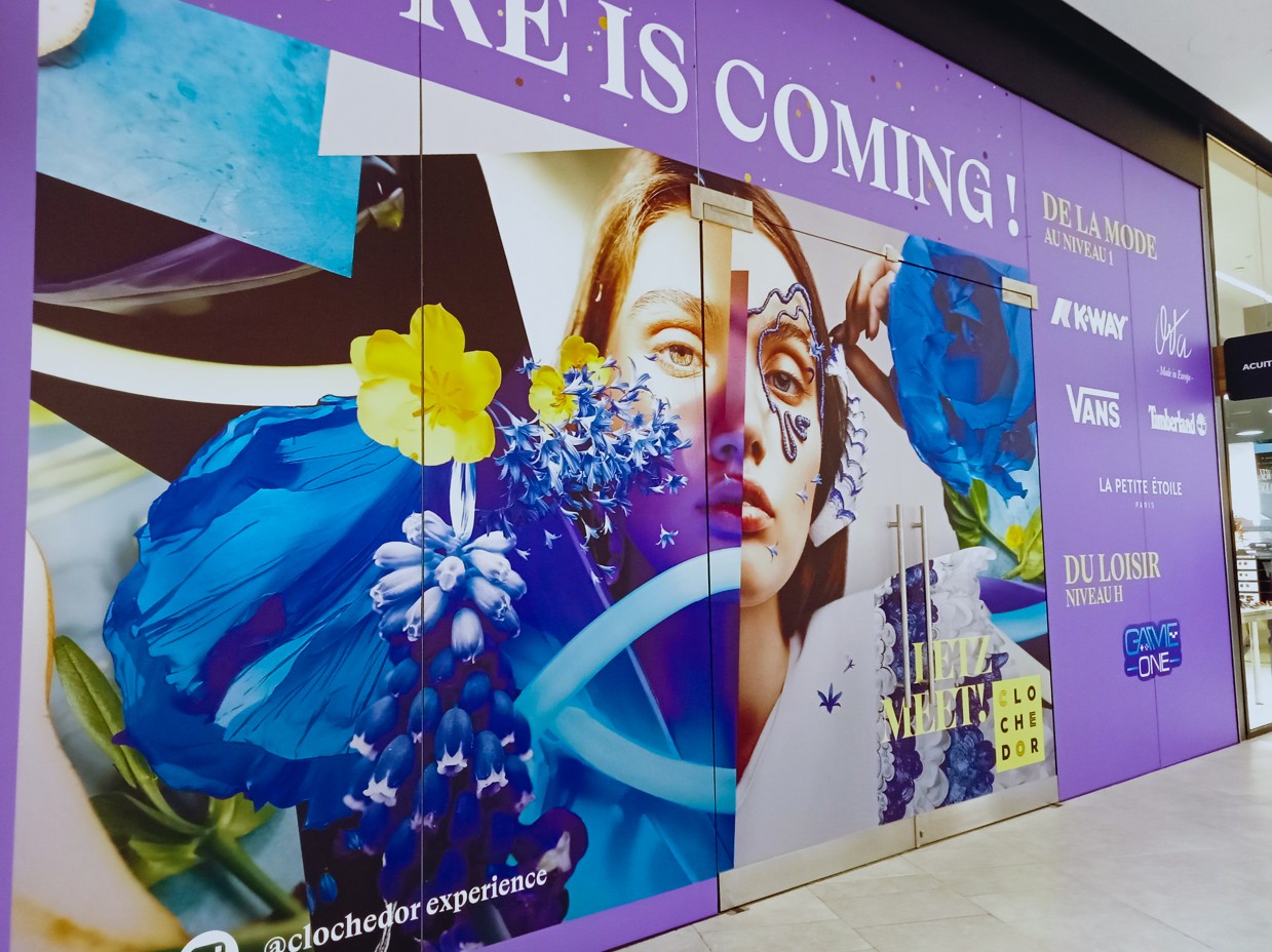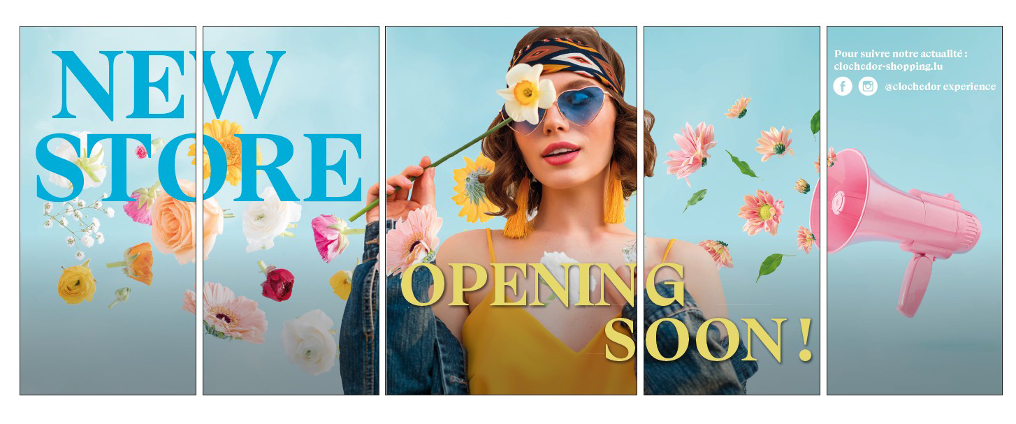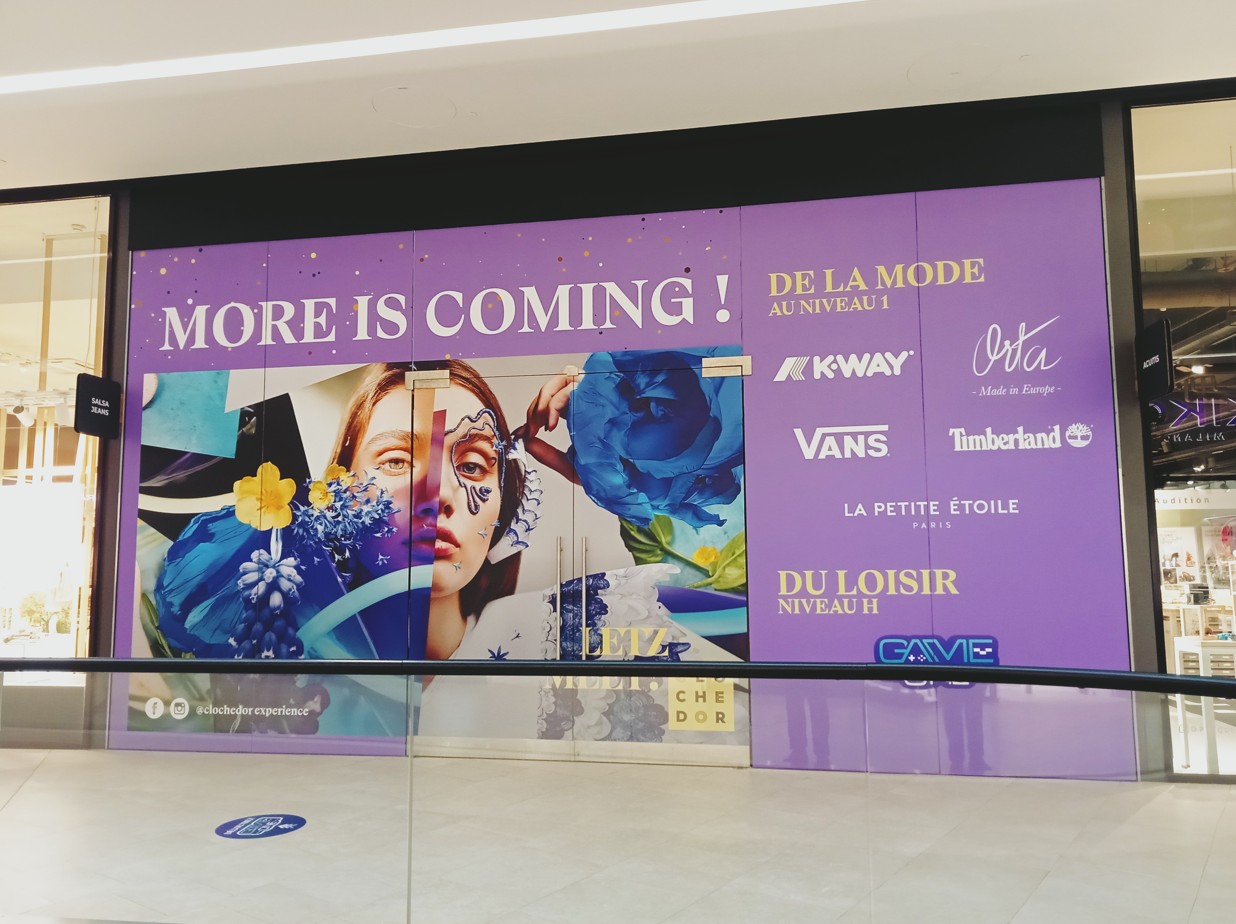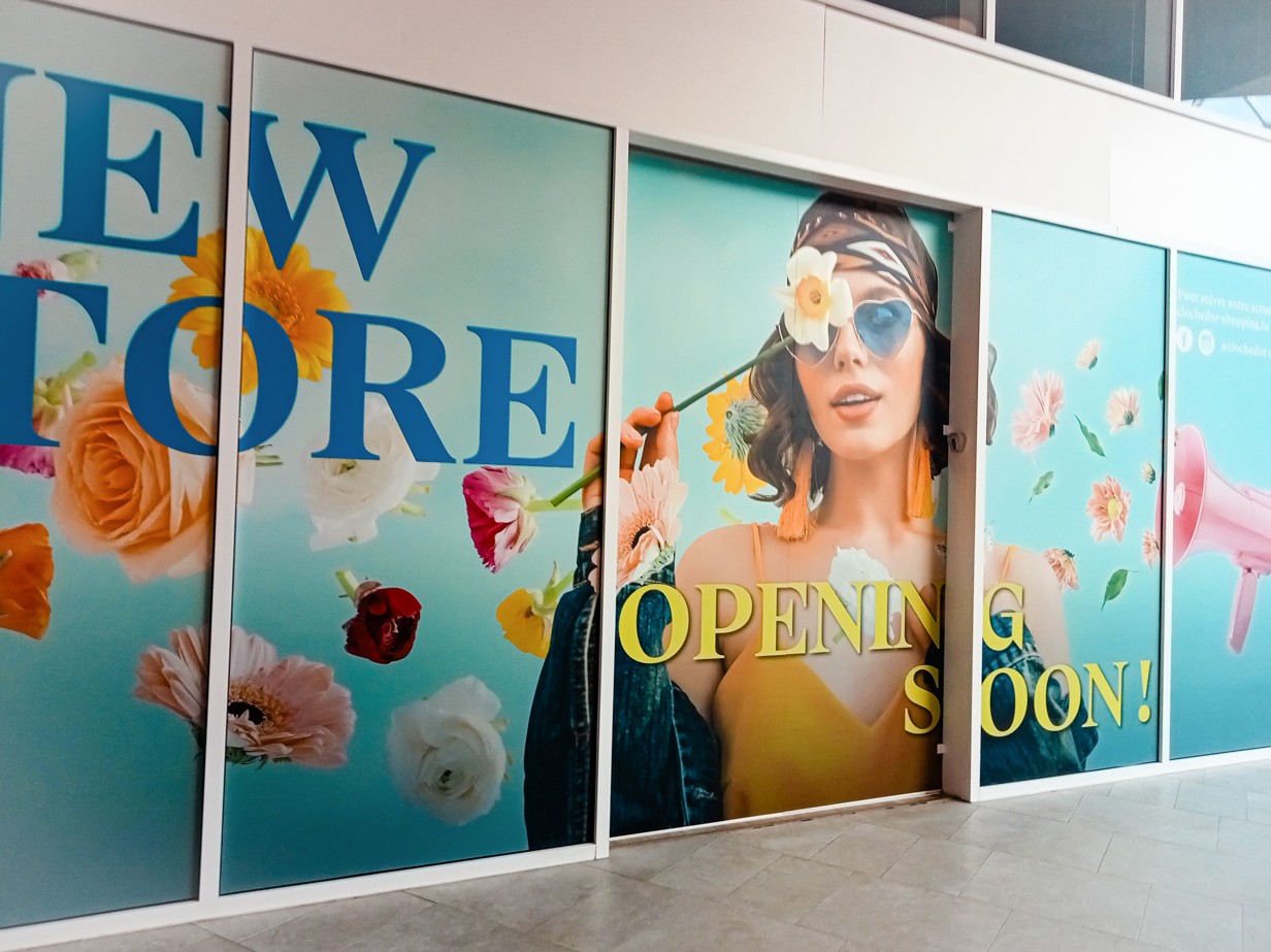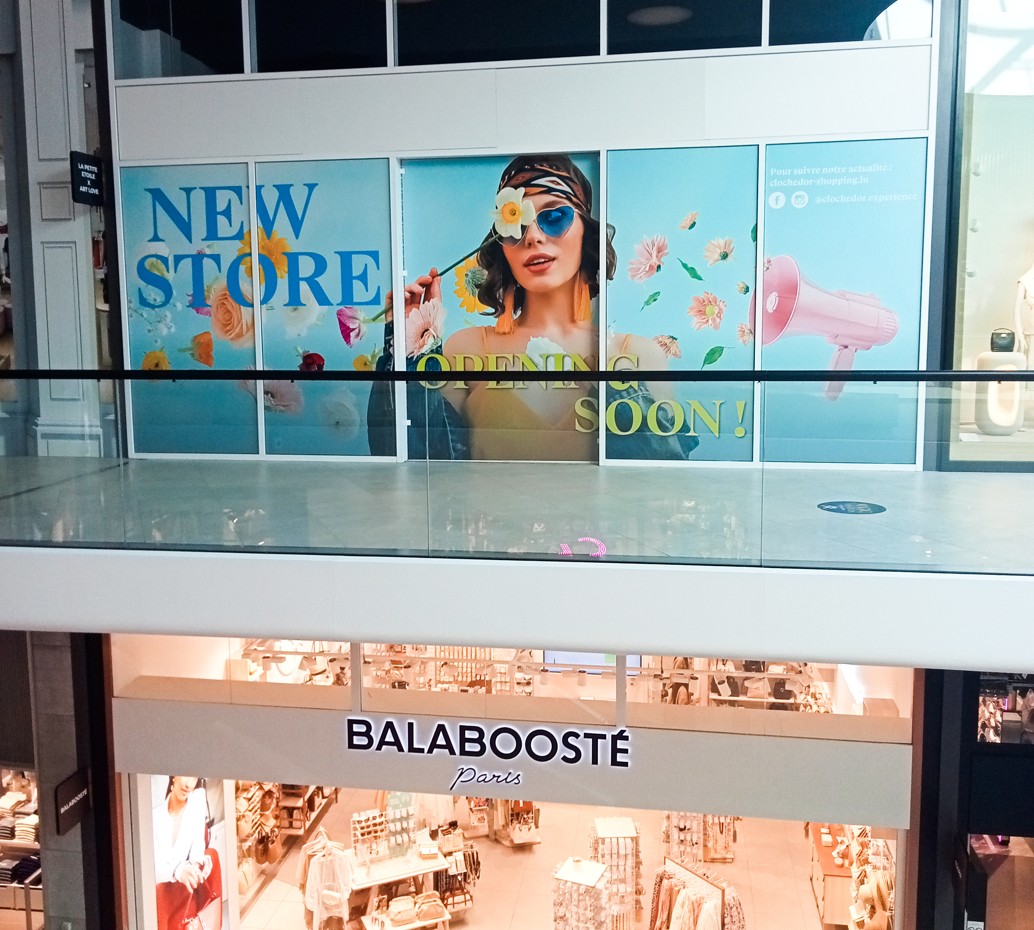 Pour cette vitrine au centre commercial Cloche d’Or au Luxembourg, l’objectif était d’annoncer l’arrivée prochaine d’un nouveau magasin.